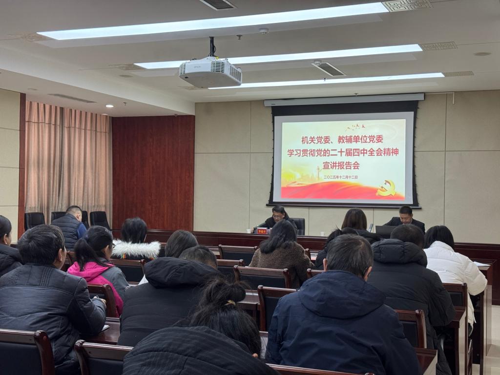 12月12日下午,机关党委、教辅单位党委在勤业楼A108会议室举行党的二十届四中全会精神宣讲报告会。学校党的二十届四中全会精神宣讲团成员、马克思主义学院教师杨永兴为机关和教辅单位党员干部做了“乘势而上、接续奋斗,为推进中国式现代化建设贡献力量”的宣讲报告。机关党委、教辅单位党委60余名党员干部参加了宣讲报告会。报告会由机关党委书记李建平主持。