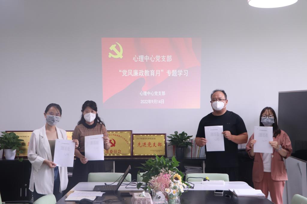 9月14日,心理中心党支部在和义楼107召开专题学习会,中心全体人员参加。会上,支部书记王宝玲传达了学校关于开展2022年“党风廉政教育月”活动的通知精神及《2022 年“党风廉政教育月”活动实施方案》文件要求。